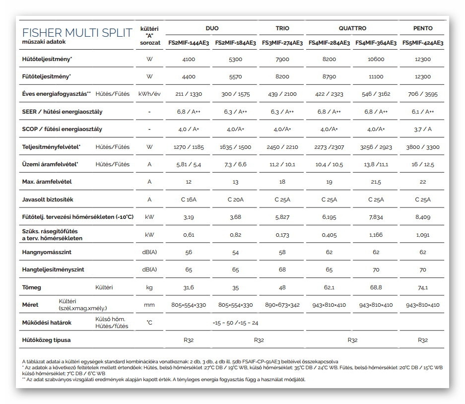 A Fisher FS4MIF-284AE3 Multi klíma kültéri egység (max. 3 beltéri egységhez) fontos tulajdonságai:
