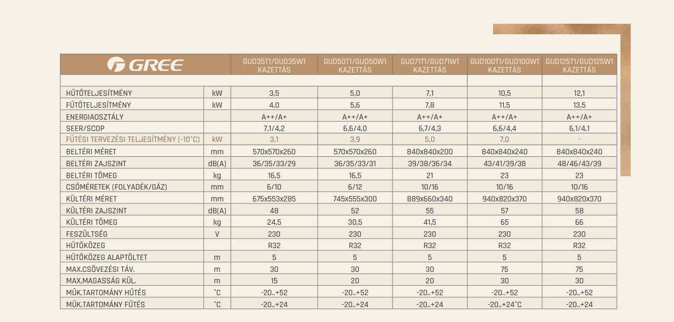 A Gree GUD35T / GUD35W Kazettás Split klíma fontos tulajdonságai: